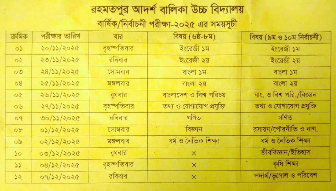 আগামী ২০/১১/২০২৫ তারিখ হইতে ষষ্ঠ শ্রেণী হইতে নবম শ্রেণী পর্যন্ত বার্ষিক পরীক্ষা এবং দশম শ্রেণীর নির্বাচনী পরীক্ষা শুরু হইবে